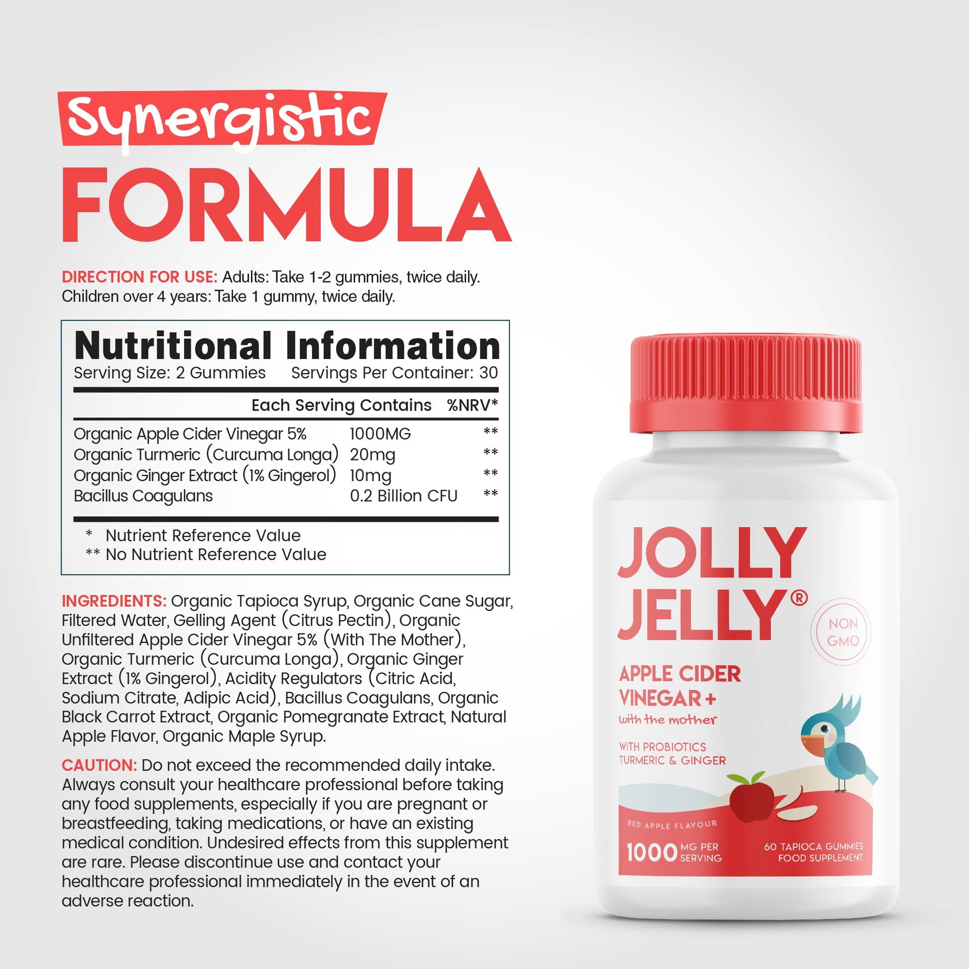 • WITH THE MOTHER: All of the health benefits associated with apple cider vinegar come from the “Mother.” The “Mother” is the cloudy substance in pure apple cider vinegar that contains probiotics, natural protein, and acetic acid. Raw and unfiltered, Jolly Jelly apple cider vinegar retains the “Mother” — and all of its health benefits.