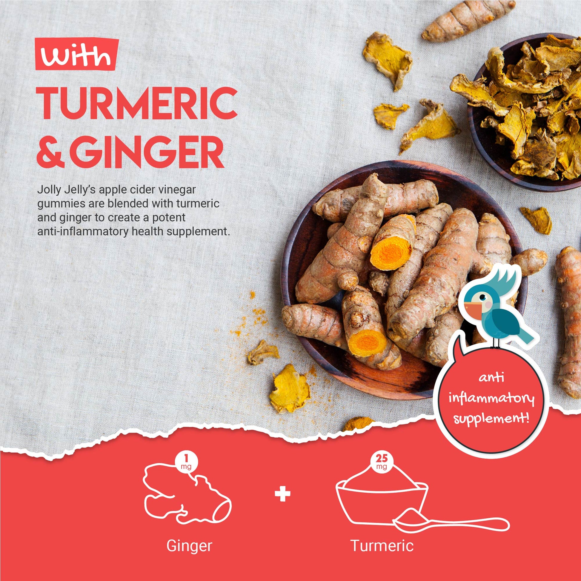 • PURE INGREDIENTS: Organic Tapioca Based gummies made with 500mg apple cider vinegar per serving, infused with organic ginger, turmeric, and probiotics this is the perfect and most tasty way to consume these superfoods.